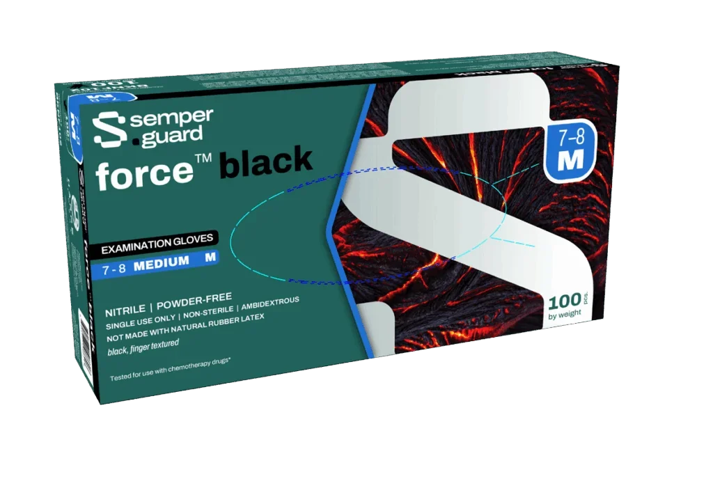 semperguard® force™ black exam nitrile gloves are made from high-quality nitrile for durability and puncture resistance. Textured fingers provide a secure grip, ensuring users can handle tools and materials confidently, even in challenging conditions. These gloves are well-suited for protection from chemicals, oils, and other contaminants while maintaining dexterity and comfort.