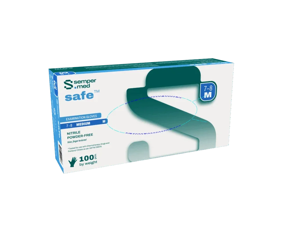 Sempermed safe™ nitrile examination gloves are designed for high-risk environments where protection and performance are essential. Textured fingertips provide a secure grip in both wet and dry conditions. Tested against 56 chemotherapy drugs and fentanyl, these gloves are ideal for medical, lab, food, and safety applications.
