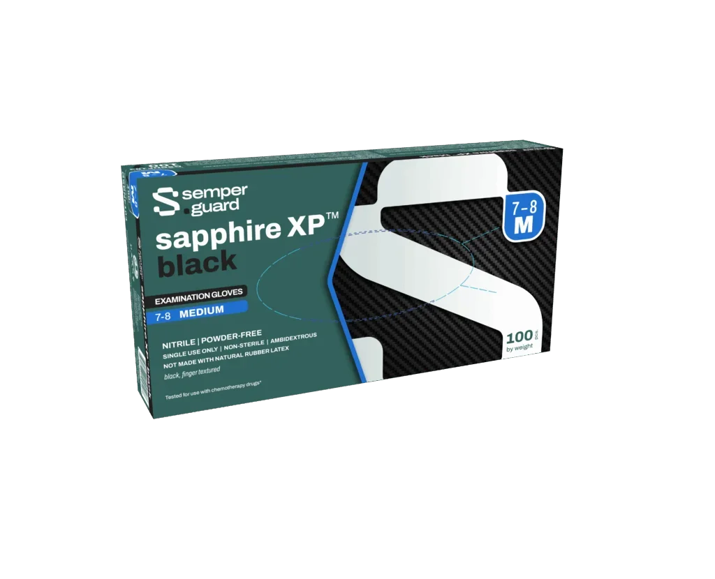semperguard® sapphire™ XP black exam nitrile gloves are designed to offer excellent grip and tactile sensitivity, making them ideal for a variety of tasks that require precision and control. The black color of the gloves are especially appealing in safety industry. The dark color helps conceal color transfer, stains, and other messes, maintaining a cleaner and more professional appearance throughout use. This feature is especially useful in environments where aesthetics and cleanliness are a priority.